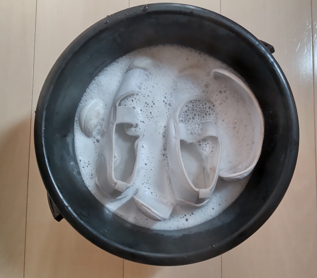 いつも元気いっぱいな証拠のお子様の靴や上靴の汚れ…毎週大変ですよね。バケツでオキシ漬けした後、ブラシでこすれば驚きの白さに。